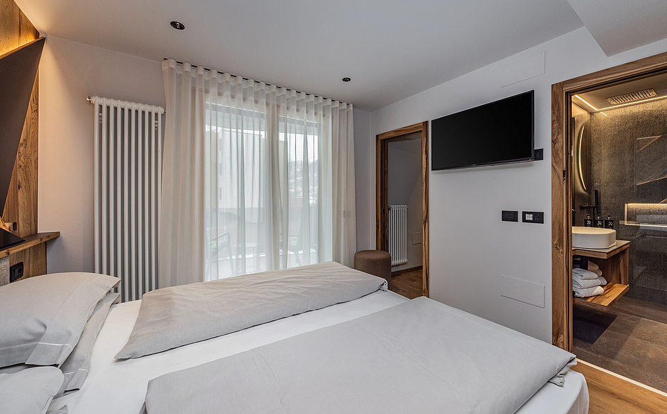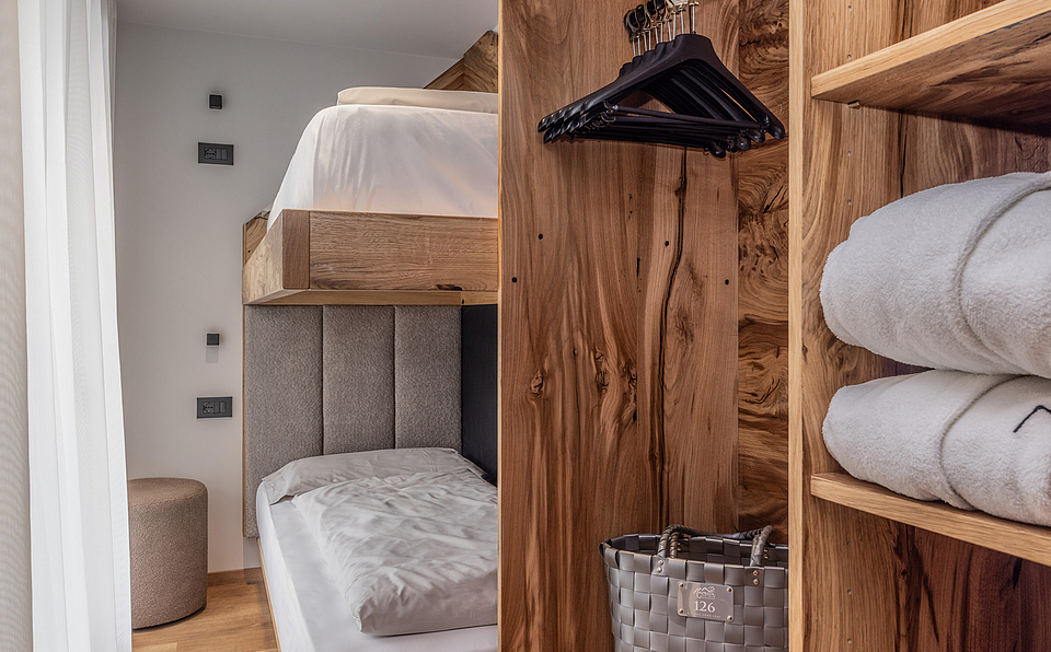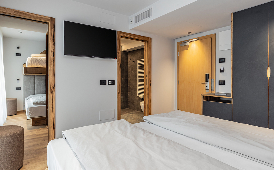 The Squad Room is the perfect accommodation for a family of four, designed to offer comfort and well-organized spaces. The main room features a stylish double bed, ideal for parents, while the children’s sleeping area includes a practical wooden bunk bed that combines sturdiness with a cozy design. The room is enhanced by a private balcony, perfect for relaxing moments with a view, offering a peaceful retreat after a busy day. The spaces are cleverly separated, ensuring privacy and distinct areas, while the shared bathroom, modern and fully equipped, is easily accessible from both sections.