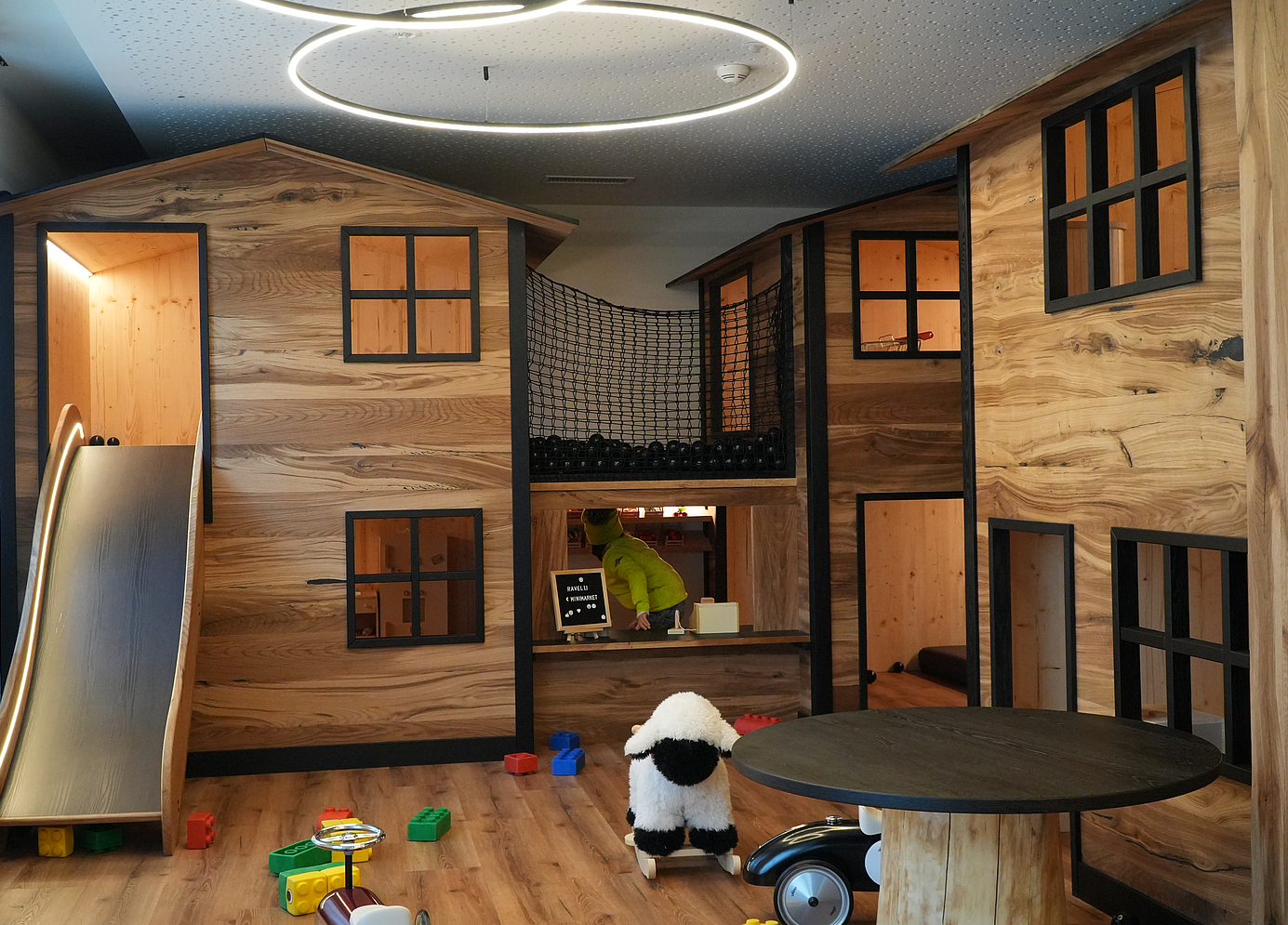 In unserem Spielplatz im Freien können Kinder sicher herumrennen, klettern und Spaß haben, während sich die Eltern mit Blick auf die Berge und einem Glas guten Weins in der Hand entspannen.