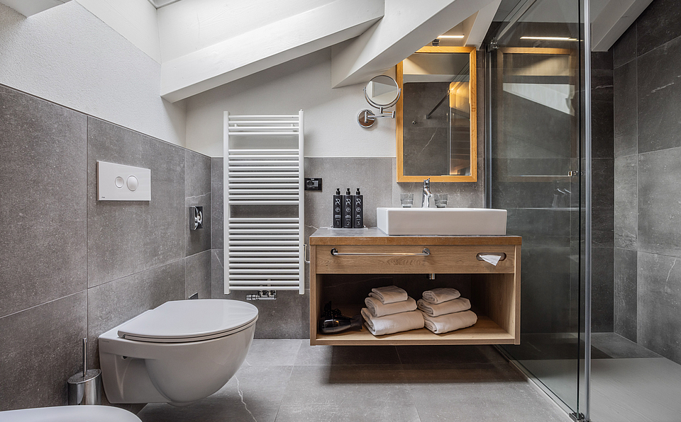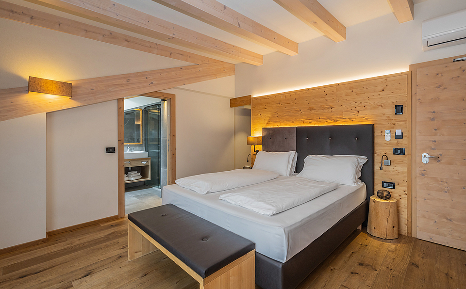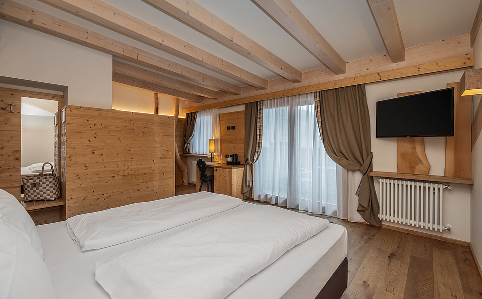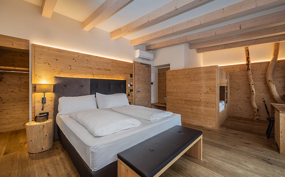 Characterized by large alpine wooden beams, this room is the perfect choice for families. With a gentle view of the mountains, the space invites moments of togetherness and relaxation, offering a warm and authentic atmosphere for an unforgettable family holiday.