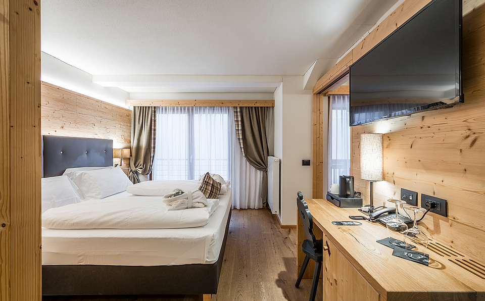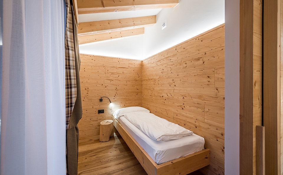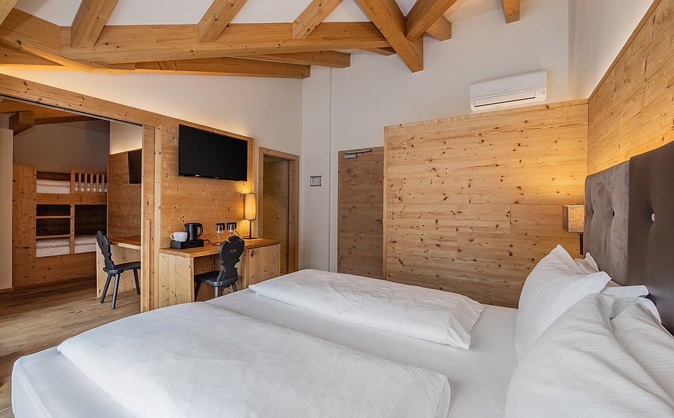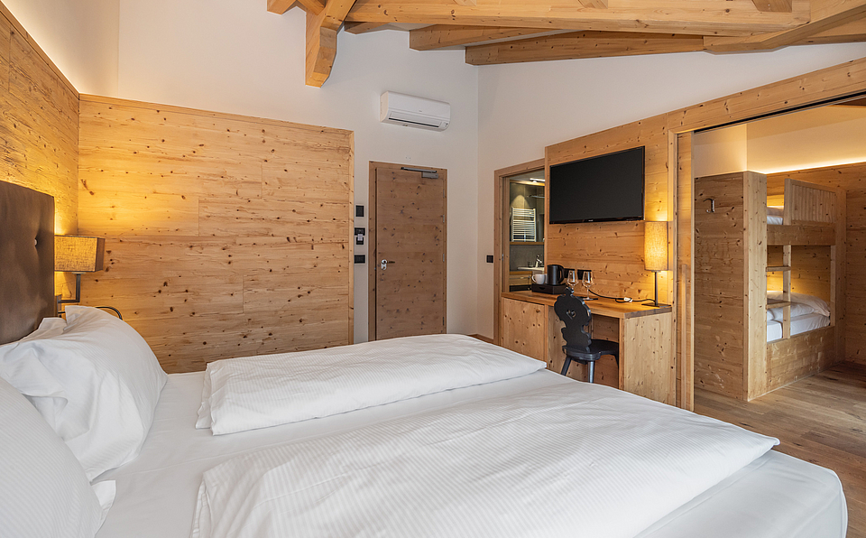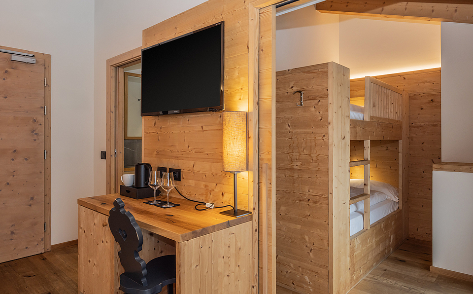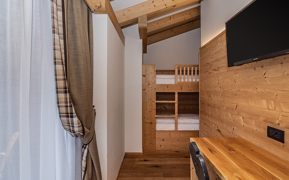 Located in the most exclusive area of the hotel, these rooms offer a charming view of the botanical garden and the majestic mountains of Val di Sole. The separate spaces ensure privacy and relaxation for the whole family, while the wooden bunk beds will become the favorite hideaway of your little explorers.