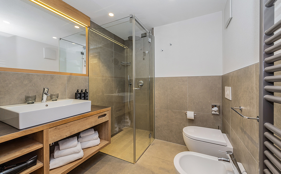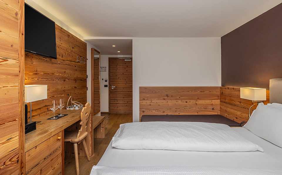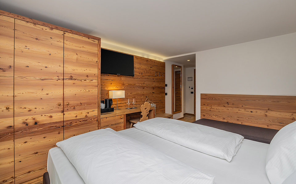 Characterized by an intimate and refined alpine charm, this room combines comfort with modern style. With an inward-facing view and a hint of the mountains, it’s perfect for those seeking peace and well-being, surrounded by alpine nature.