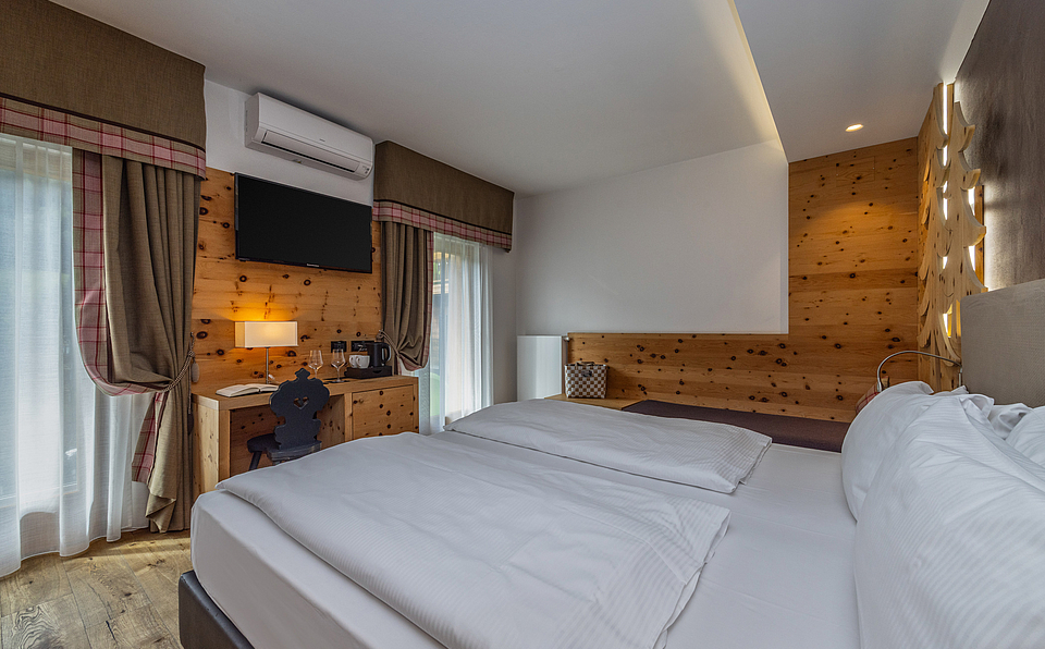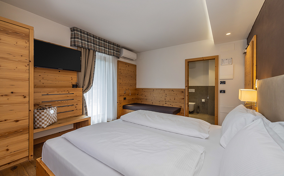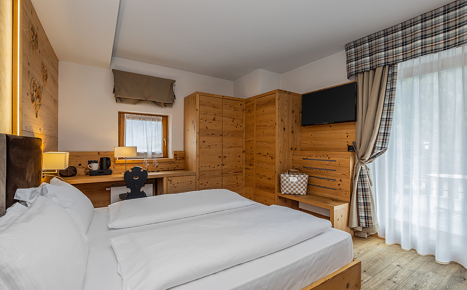Spacious and bright, these rooms offer a charming view of the botanical garden and the valley. The private balcony and alpine-style furnishings create an oasis of comfort, perfect for couples and families, where every detail is designed to ensure a pleasant and memorable stay.