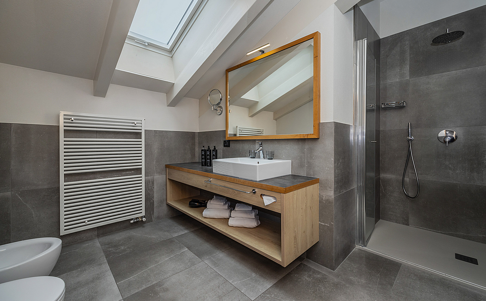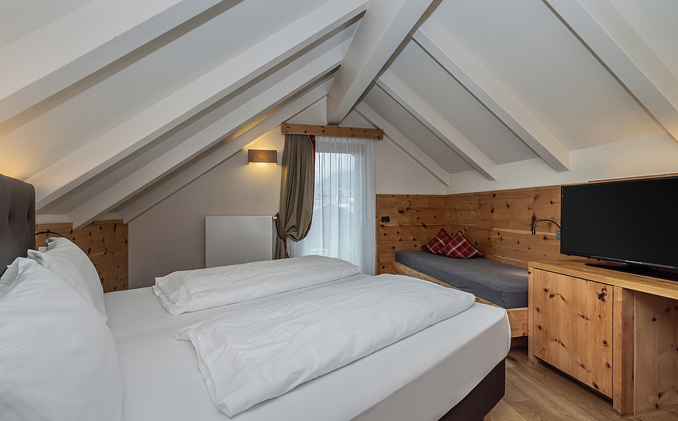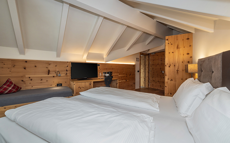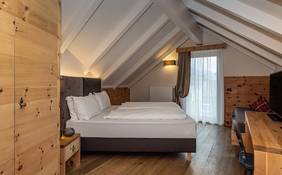 A unique atmosphere beneath the majestic exposed beams of this attic room. The most spacious in its category, it combines the authenticity of alpine design with maximum comfort, offering a truly special stay experience—perfect for those seeking bright and generous spaces.