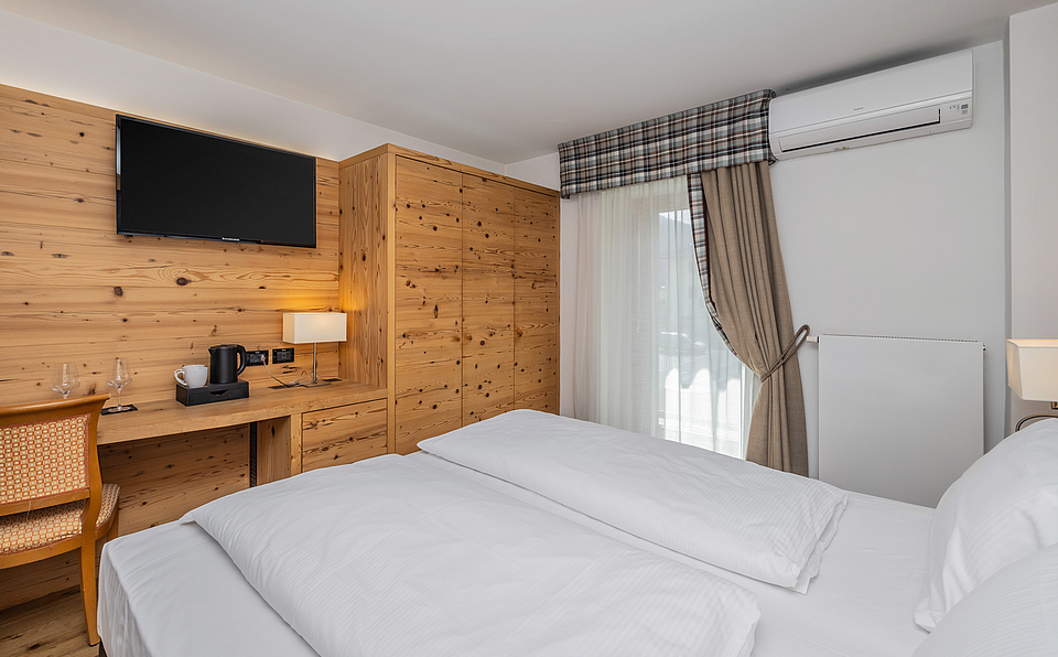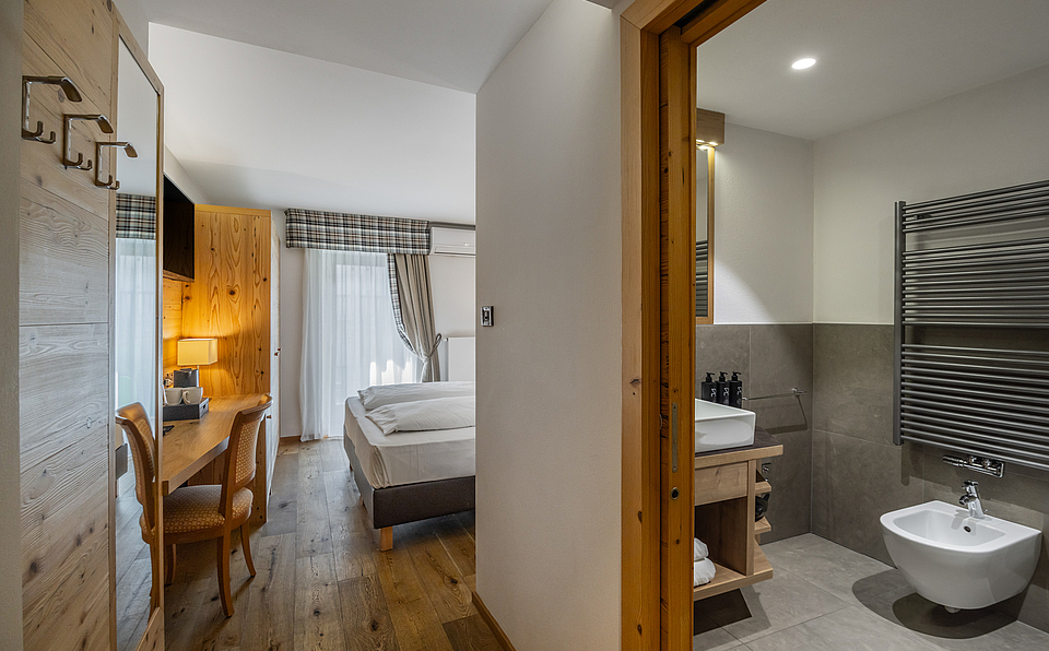 Alpine charm is reflected in every detail of this room. The warm wood tones and side balcony provide a quiet corner with a slight mountain view. Perfect for those who desire authentic comfort and a direct connection with nature, this room is ideal for a relaxing getaway.