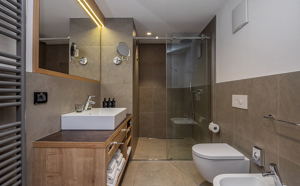 Spacious and bright, these suites offer all the room you need for a comfortable stay with family or friends. The corner location provides dual views: on one side, the majestic Monte Sasso Rosso, and on the other, a panorama of the front of the property. An oasis of privacy and relaxation in the heart of Val di Sole.