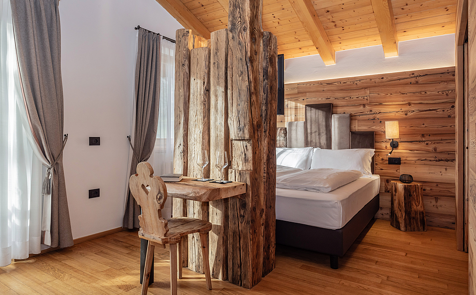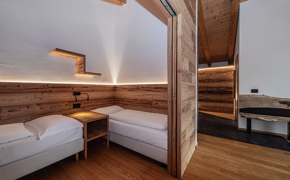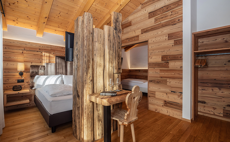 The essence of Alpine charm in an exclusive setting. Antique wood surrounds the suite with warmth and elegance, while a room dedicated to the little ones makes this accommodation perfect for families. A refined retreat where nature blends with the truest comfort.