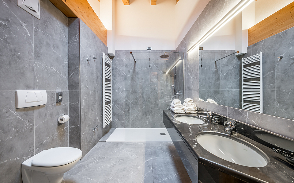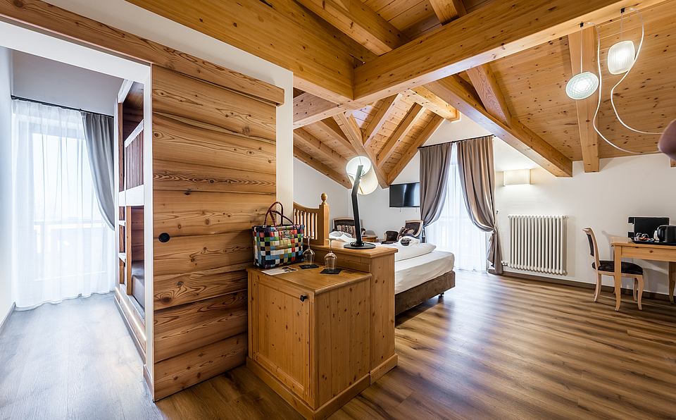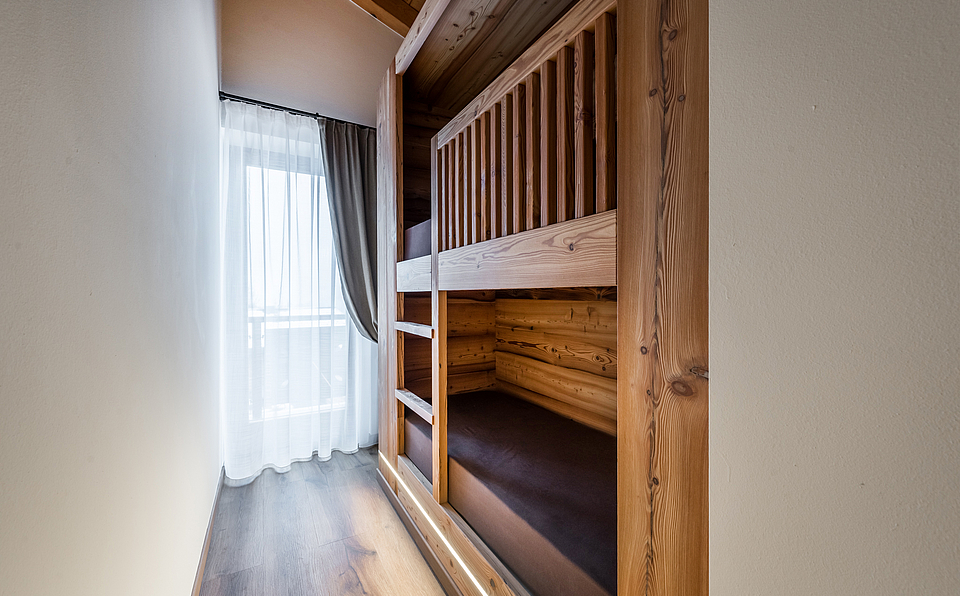 A perfect blend of space and Alpine beauty. This suite, with its rustic yet elegant style, features a spacious walk-in closet, a master bathroom, and a room with wooden bunk beds—ideal for the little ones. The panoramic mountain view adds a touch of charm and absolute comfort to the experience.
