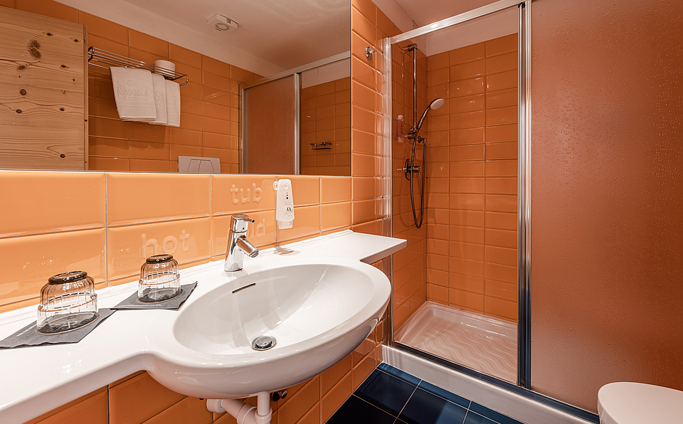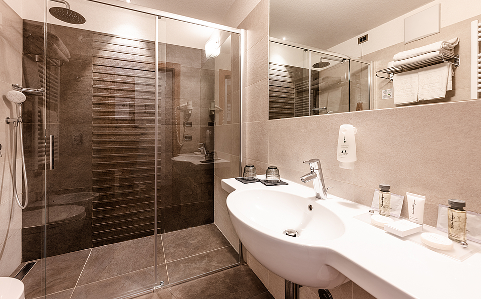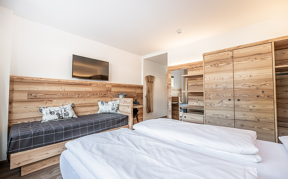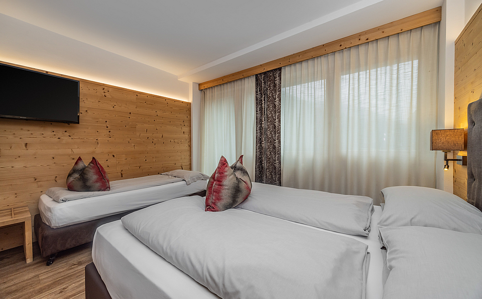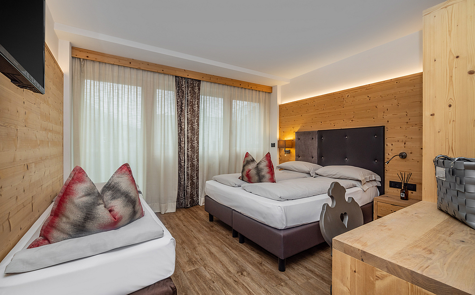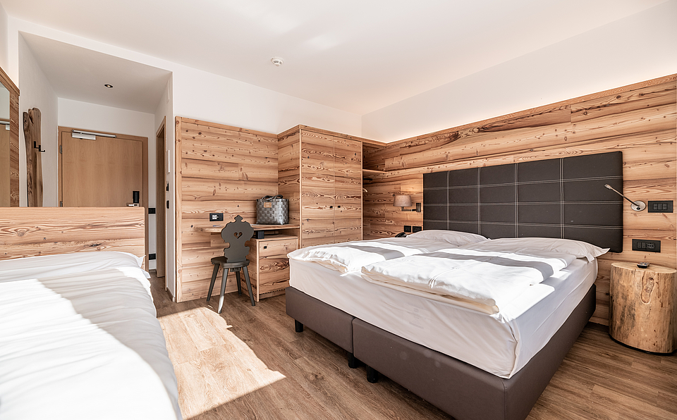 The Alpine room with Balcony is a cozy retreat, featuring warm interiors made of aged larch wood that evoke alpine charm. Equipped with three single beds, a private bathroom, and a flat-screen TV, it offers everything needed for a comfortable stay. The balcony invites you to relax and enjoy the fresh mountain air, while the Wellness Bag, complete with a soft bathrobe and towel, is included for the entire duration of your stay. Perfect for those who wish to combine comfort with an authentic mountain atmosphere.